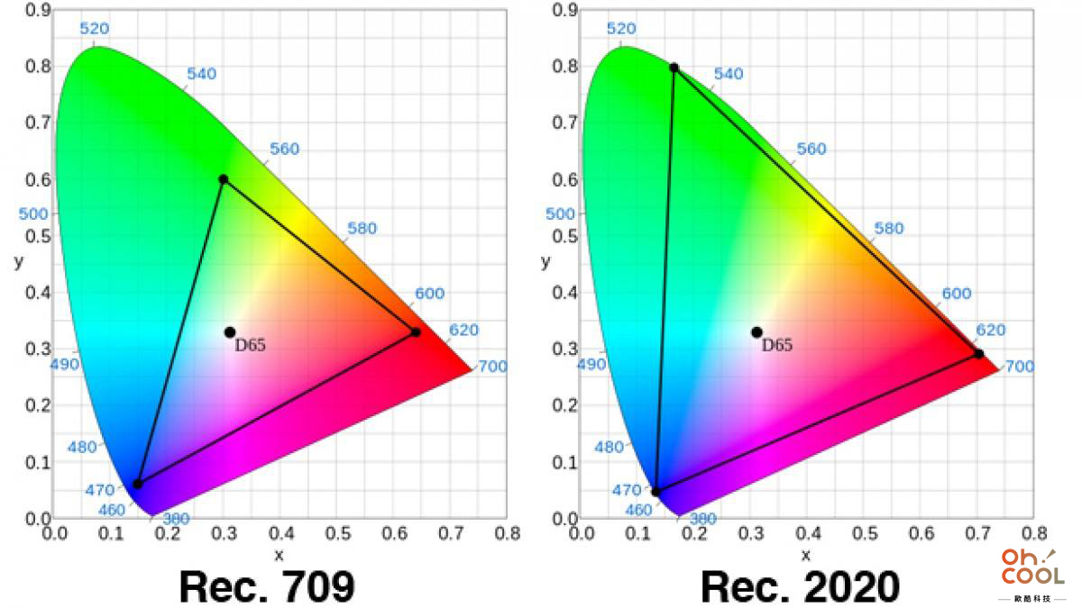 相較於在色域三角形可見 BT.2020 色域標準(75.8% 可見色域) 所佔的面積,較 Rec.709 標準(39.5% 可見色域)的圍大一倍,表示 BT.2020 色域標準能顯示更多色彩,令畫面色彩更為豐富及分明,呈現更加自然的畫面表現。