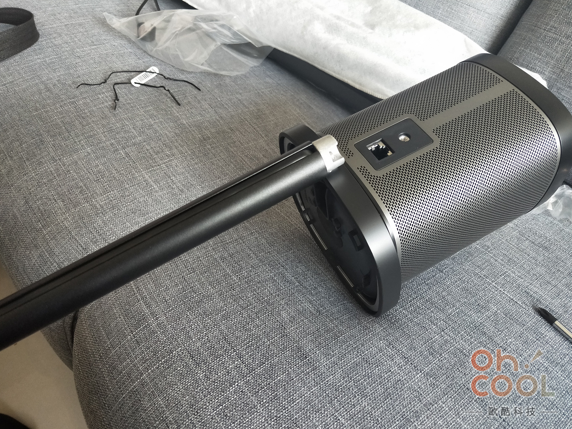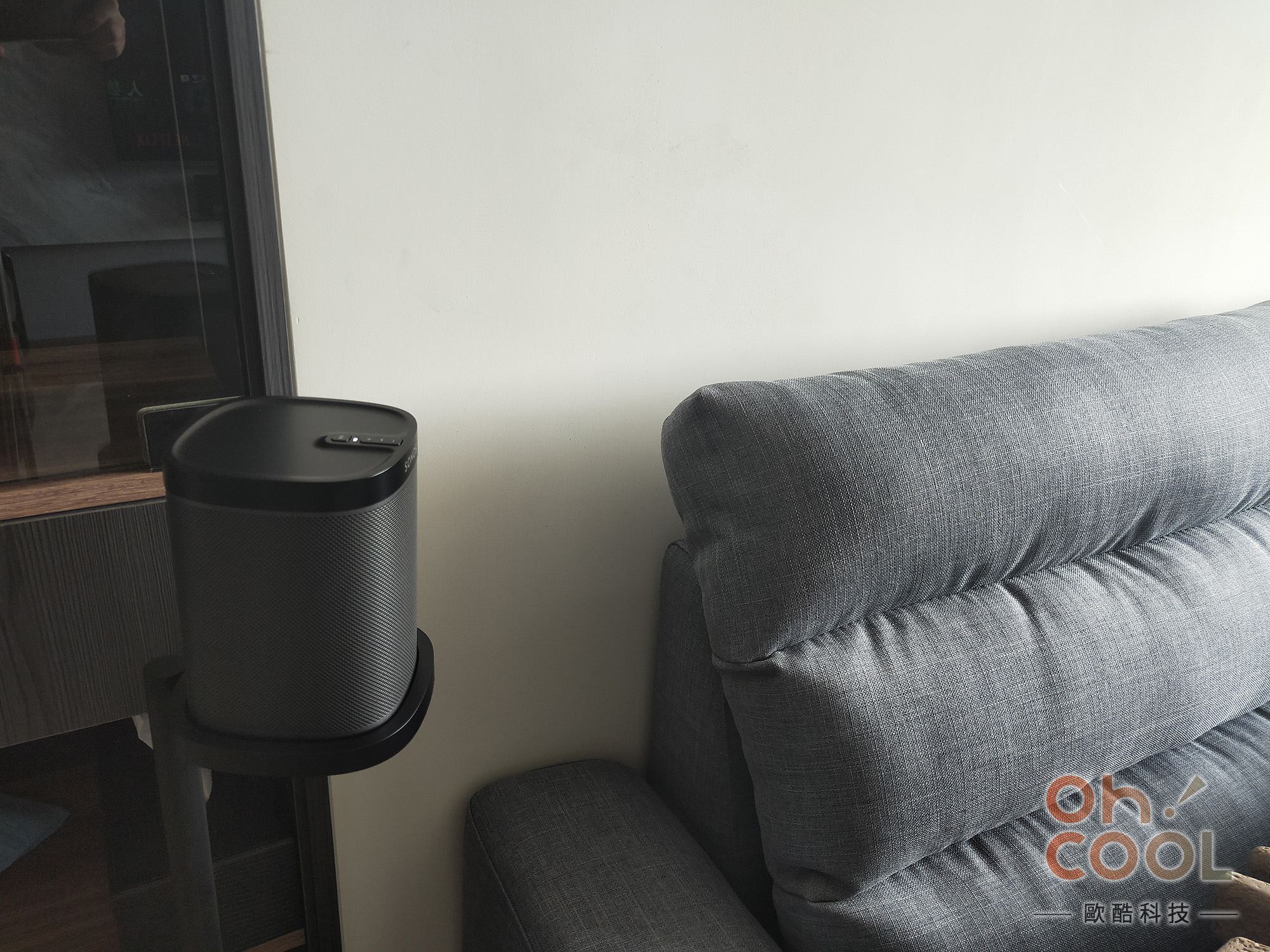 Play:1 的支架桿和底座可以巧妙的隱敝住大部分外露的電源線,底座的緩衝墊也能穩固住上方的 Play:1,兼具了實用性與視覺性,支架桿上有線溝設計,剛好可以讓電源線平整的置入,看得出產品在設計上的用心。上圖是支架和 Play:1 接合之前的特寫、下圖則是支架和做為緩衝墊的底座。