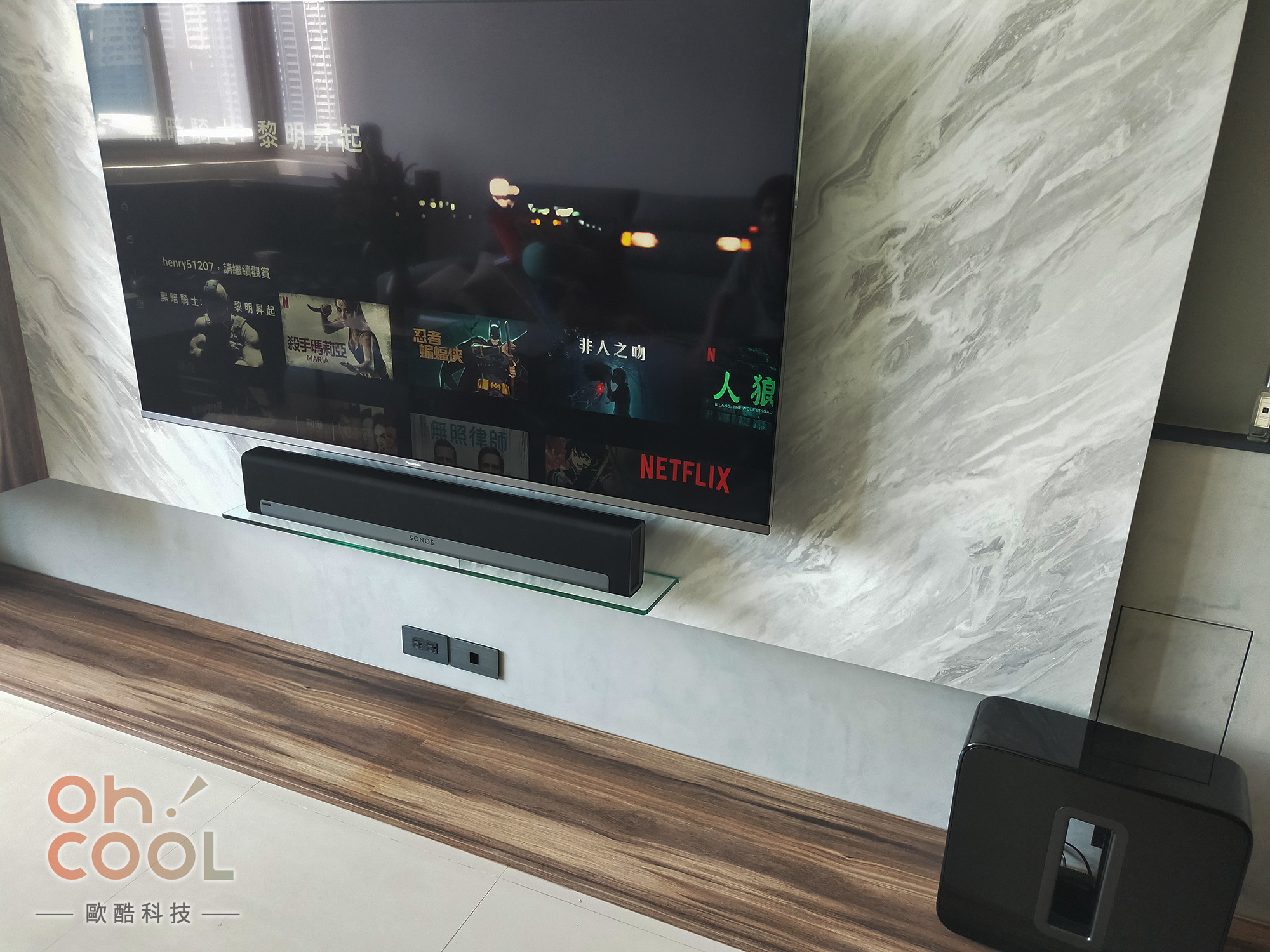 在連先生的新居安裝 SONOS 並不需要花太多時間,從我們帶著產品進門開始,經過拆箱、組裝支架、調校設定,一直到體驗的這段過程,都是一個小時以內就能搞定的。從上圖中我們可以看到一整片大理石電視主牆,電視下方的玻璃板就是為了擺放 Playbar 所預留,完全恰到好處的把 SONOS 結合進新居的客廳,打造出一套標準的 5.1 無線劇院系統。