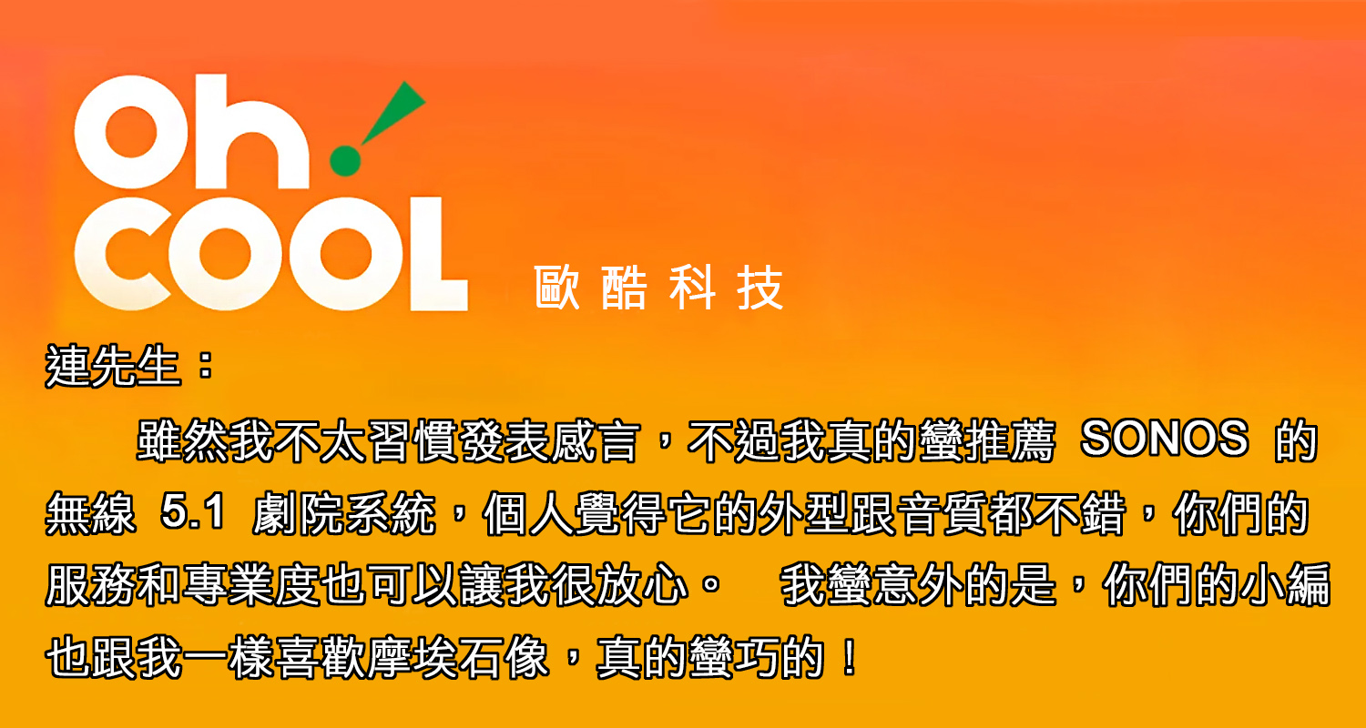 看電影是現代人最主要的休閒活動之一,從事資訊業的連先生也不例外,何況他也很講究聲音的表現,但就是不想在新家擺一套複雜的傳統家庭劇院,只想要簡單、方便、音質又有一定水準的品牌音響,另外的訴求則是希望家人也能輕鬆操作。連先生表示:當他在搜尋引擎打上 SONOS 就找到了歐酷,發現我們有提供試聽的服務後,便不假思索立刻和我們預約,帶著愛妻一起來體驗 SONOS 5.1 無線劇院系統。