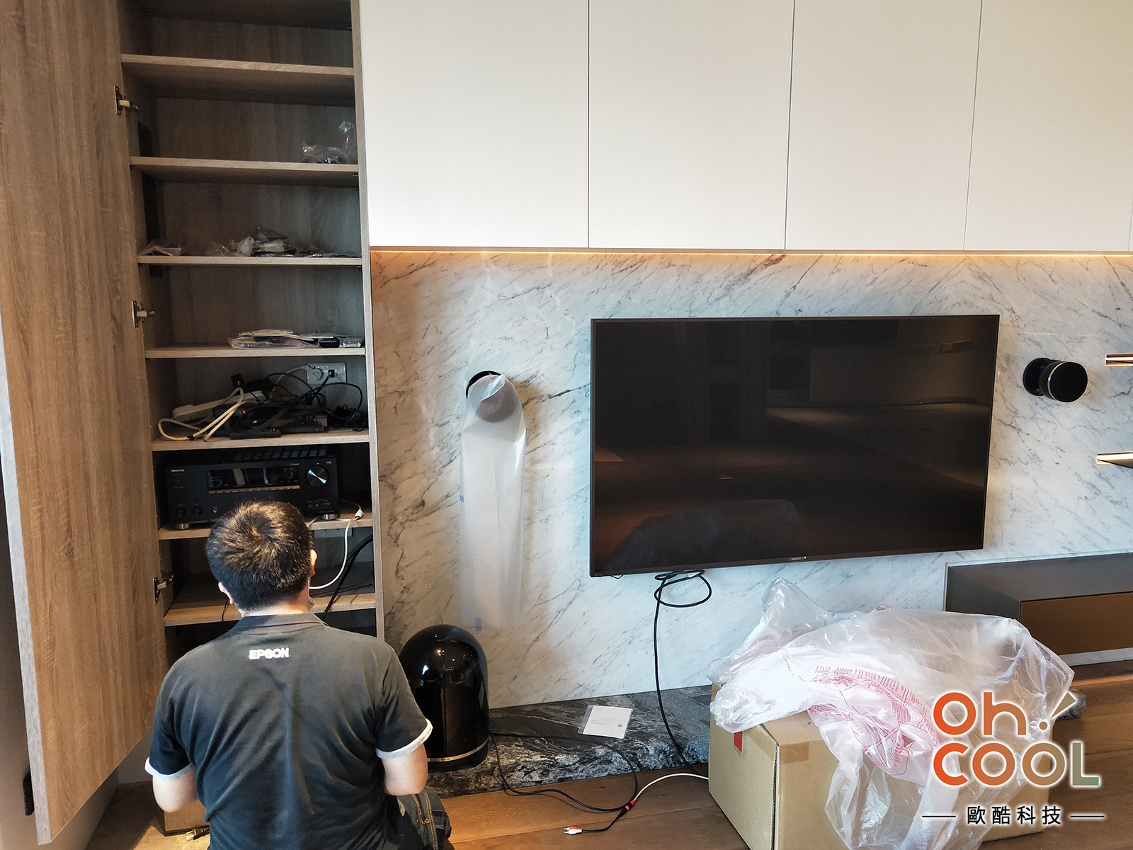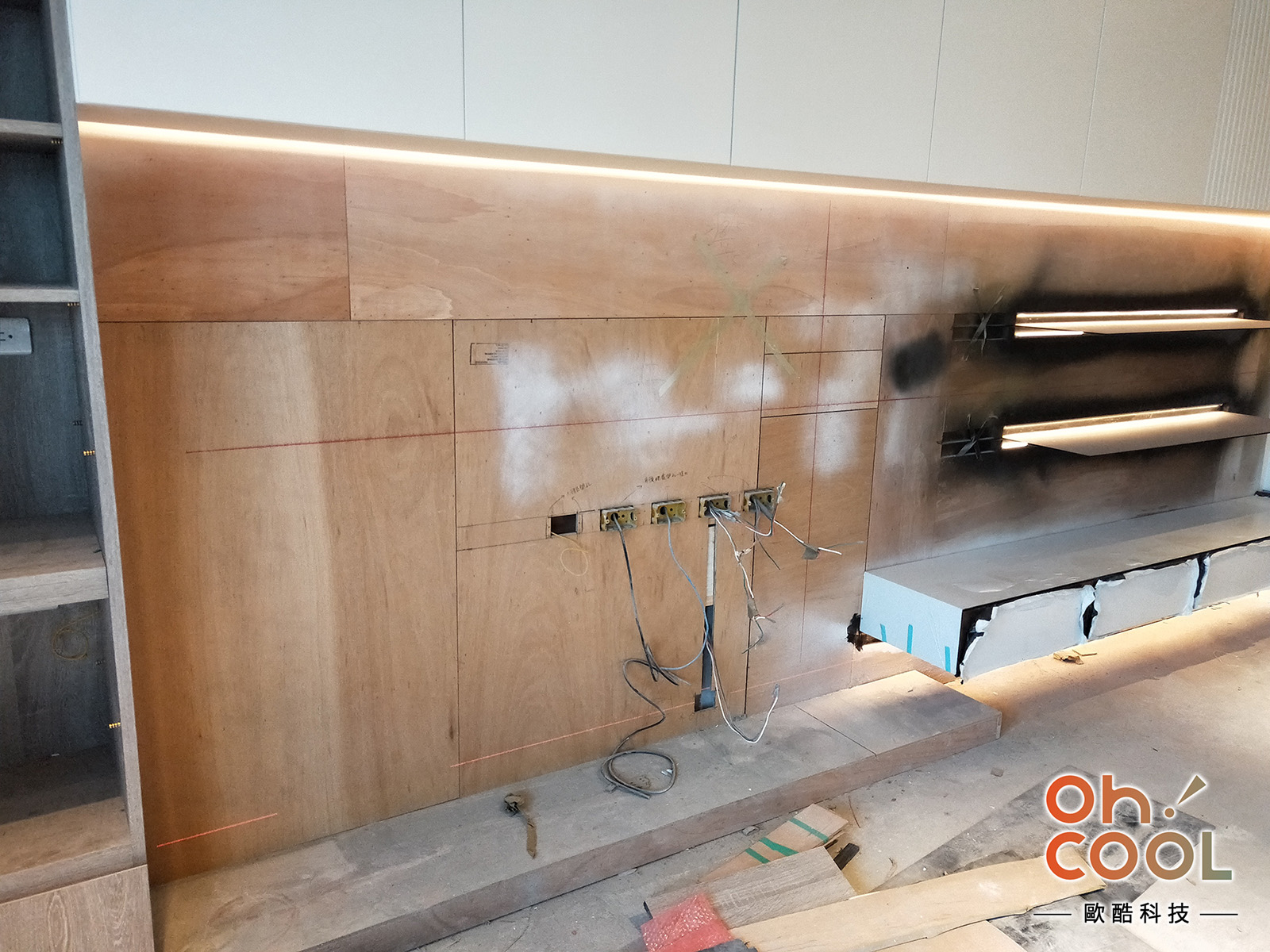 先把電視欲安裝的位置做上記號,接著立刻進行鑽孔和配線。我們都知道,客廳是現代人們回到家除了睡覺之外,最常待、也是待得最久的地方,所以影音設備可以說是重點中的重點,歐酷一直以來都是用最專業的態度來幫客戶們進行規劃。
