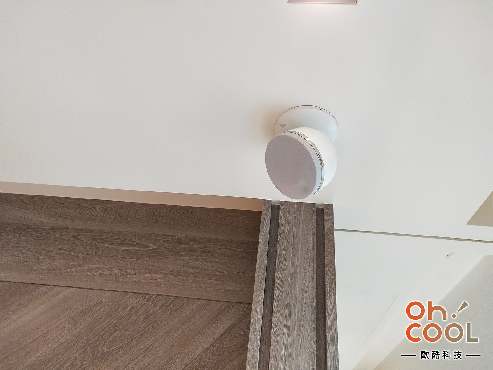 還有一對固定在天花板上的 FOCAL Dome 白色喇叭做為後環繞聲道,一前一後、一黑一白,跟室內的格局與裝潢也結合得洽到好處,我們就是要讓業主的影音設備可以兼顧到實用性和視覺效果。