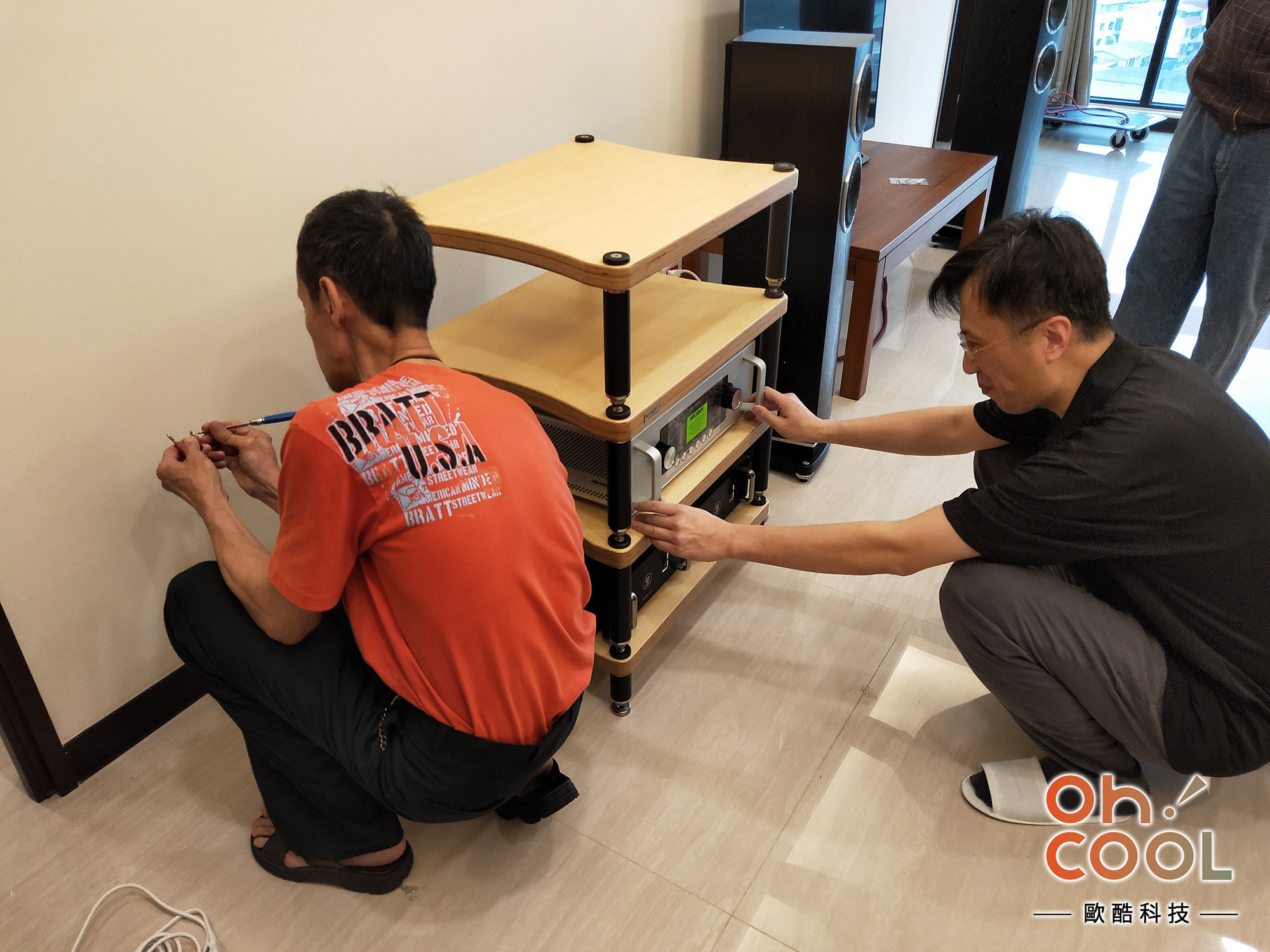 等上述這些設備都到齊了,我們第二次來到板橋業主這裡,當天除了兩位醫師和我們歐酷之外,現場還有音響線材的廠商人員,大家開始分工合作、各展所長,一一把這些器材安裝、佈線、調音、擺位,務必要讓現場的視聽效果達到最好的狀態。