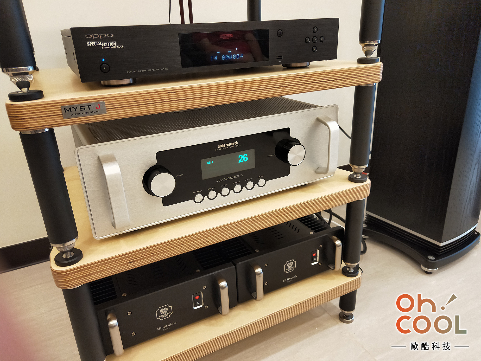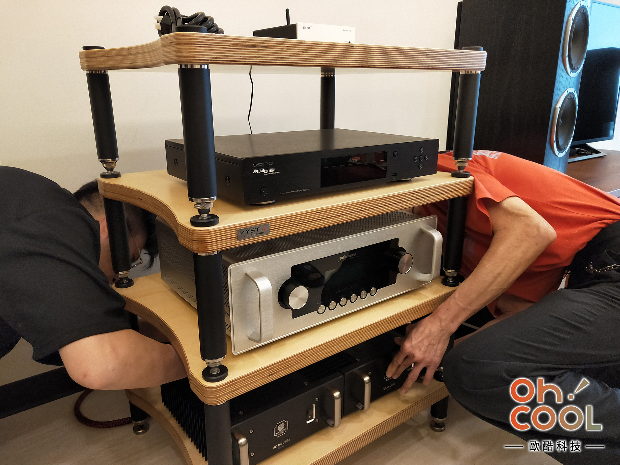 三月下旬時,歐酷接到魏醫師的來電,簡單了解一下業主的需求,我們便約隔天在板橋和這兩位醫師碰面。現場勘查討論的結果,我們幫業主規劃的訊源是 OPPO 203 歐酷版、FYNE AUDIO F501 兩聲道喇叭(MYST音響架),以及 audio research LS28 前級和Monarchy Audio SM-70PRO 後級,加上 OLED 4K 電視,預計在四月上旬沈爸沈媽搬進來以前就可以搞定。