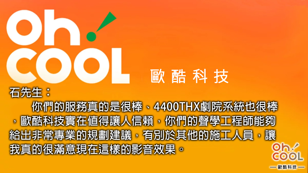 歐酷協助業主石先生完成他的小小夢想,成功打造一個屬於自己的影音新天地,相信在未來的幾年內,他都能在這裡盡情擁有絕佳的視聽感受。歐酷除了有很大的信心,能讓業主對我們的規劃感到滿意之外,透過這個案例分享也明白一個道理:只要選擇對的商品,又有優秀的影音團隊,再加上專業的規劃和擺位,就算不需要多高價位的器材,也能擁有不錯的視聽效果。這次的規畫案,成功 !!!!