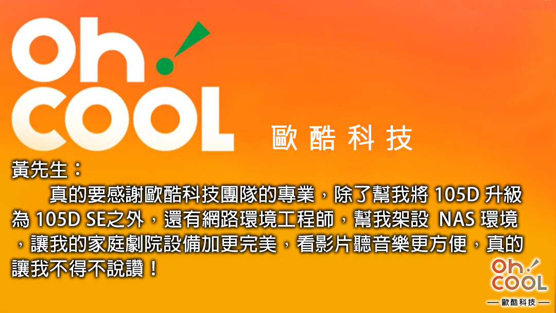 也因為 105D-SE 改機的效果相當好,令黃先生十分滿意,所以他對歐酷也有很高的信任感;事隔沒多久,他也直接指定要請歐酷來幫忙。歐酷團隊再次來到黃先生家裡,不但安裝好了音響級的 NAS 系統,也把室內的網路環境也跟著一起調整優化,幫他把居家影音生活一再升級。黃先生也樂於和親朋好友分享這樣的喜悅,這何嘗不是皆大歡喜呢?