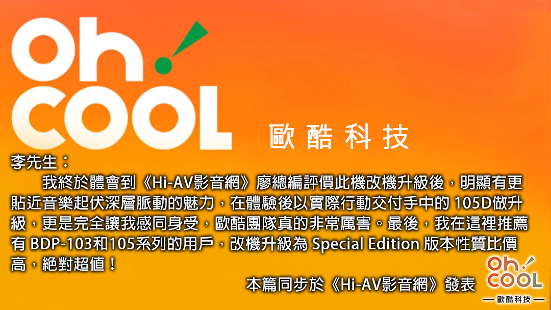 對於玩影音很有心得的李先生,是 BDP-105D 的用家,去年得知歐酷推出 103D 改機服務之後,就一直關注著歐酷。直到有一天心血來潮撥打了歐酷的電話,詢問有關改機的問題。他表示,自己有一位朋友就是 103D SE 的用家,現場聽過它的表現也確實頗具水準,用來聆聽音樂時,其音場和音樂的細節甚至可媲美自己的 BDP-105D,這讓他非常期待會不會也有105D 的升級版。李先生這一通心血來潮的電話,將會讓他有更不一樣的影音感受。