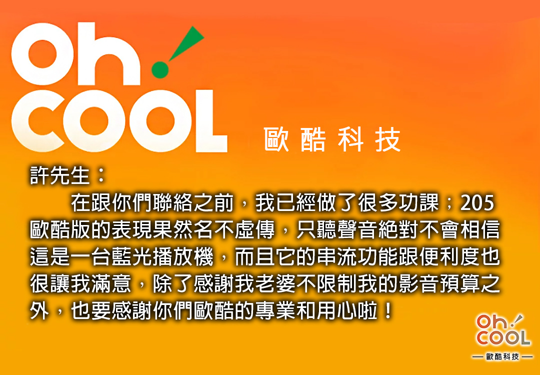在這次大約兩個小時左右的家訪中,業主許先生把訊源切換到 OPPO 205 歐酷版,並使用 Roon 操作,我們在現場陪同業主一起感受它在音樂、音效等各方面的表現之後,他也忍不住驚嘆的表示:205 歐酷版真的太超值了!這樣的音色根本不像是一台藍光播放機,加上 OPPO 205 對於串流功能上的支援度也更符合業主的要求,讓他相當滿意。在不久的將來,業主也會把投影機升級成 4K 規格,到時也會請歐酷幫忙規劃。重要的是,能得到一個超級發燒玩家如此的肯定,歐酷就明白:一切都是值得的。