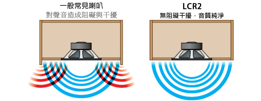 Atlantic Technology 說絕大多數音箱式喇叭都有前障板聲波繞射的問題,多餘反射的「漣漪」會影響單體發聲的清晰度(請見上方左圖),而 LCR2 喇叭的「無諧振」板材可大幅度削減聲波繞射,使得單體的發聲更精準清晰。