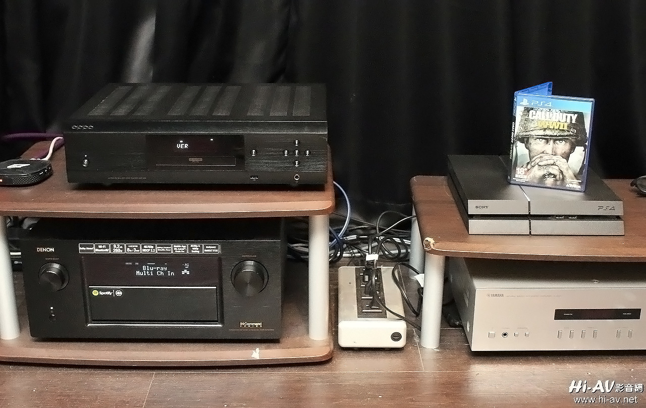 數位影音訊源主要使用OPPO UDP-205,環擴則是Denon「前旗艦」AVR-X7200WA。前者就是《Hi-AV影音網》目前的4K影音參考訊源,後者在本站購入 Denon AVR-X8500H 新旗艦環擴之後就退居二線,但仍舊是本站參考系統之一員。或許有人會質疑光是單一部OPPO UDP-205的價格就超過五支Atlantic Technology LCR2喇叭,而一部Denon AVR-X7200WA環擴的價格更是兩倍以上,這樣的搭配「當然會好聲」——其實不然,因為即使前端器材再高檔,要是後端的Atlantic Technology LCR2喇叭能耐有限,絕對還是無法有理想聲音重播表現的,我們可以將如此的「越級搭配」視為完整挖掘Atlantic Technology LCR2喇叭性能的途徑。對了,為何右側音響架上面除了有一部 Sony PS4 遊戲機,上面還擺了款熱門遊戲《Call of Duty WWII》呢?那是由於這套Atlantic Technology LCR2 5.1聲道喇叭系統,拿來玩遊戲的音效也非常好,本文最後會有描述。