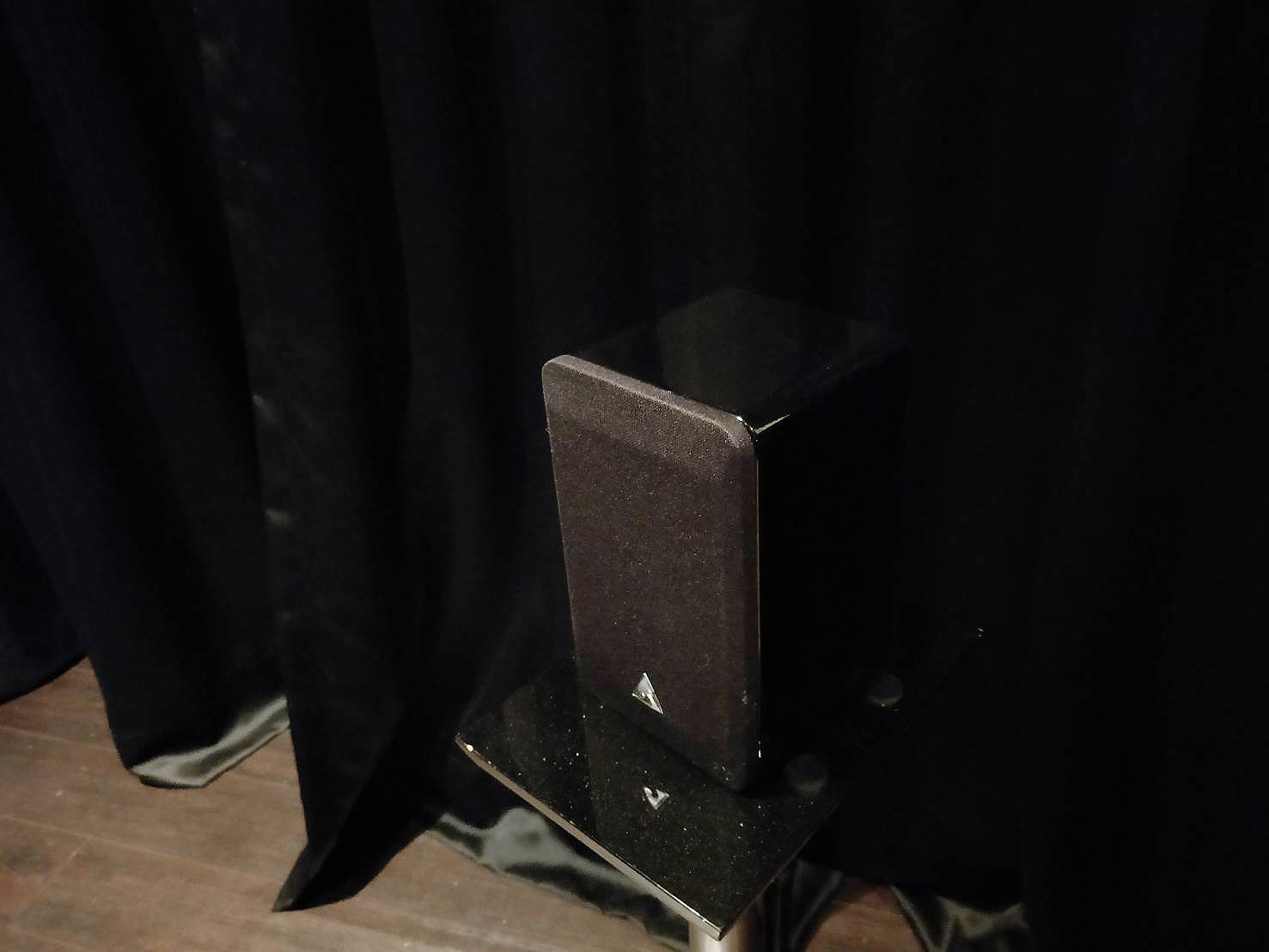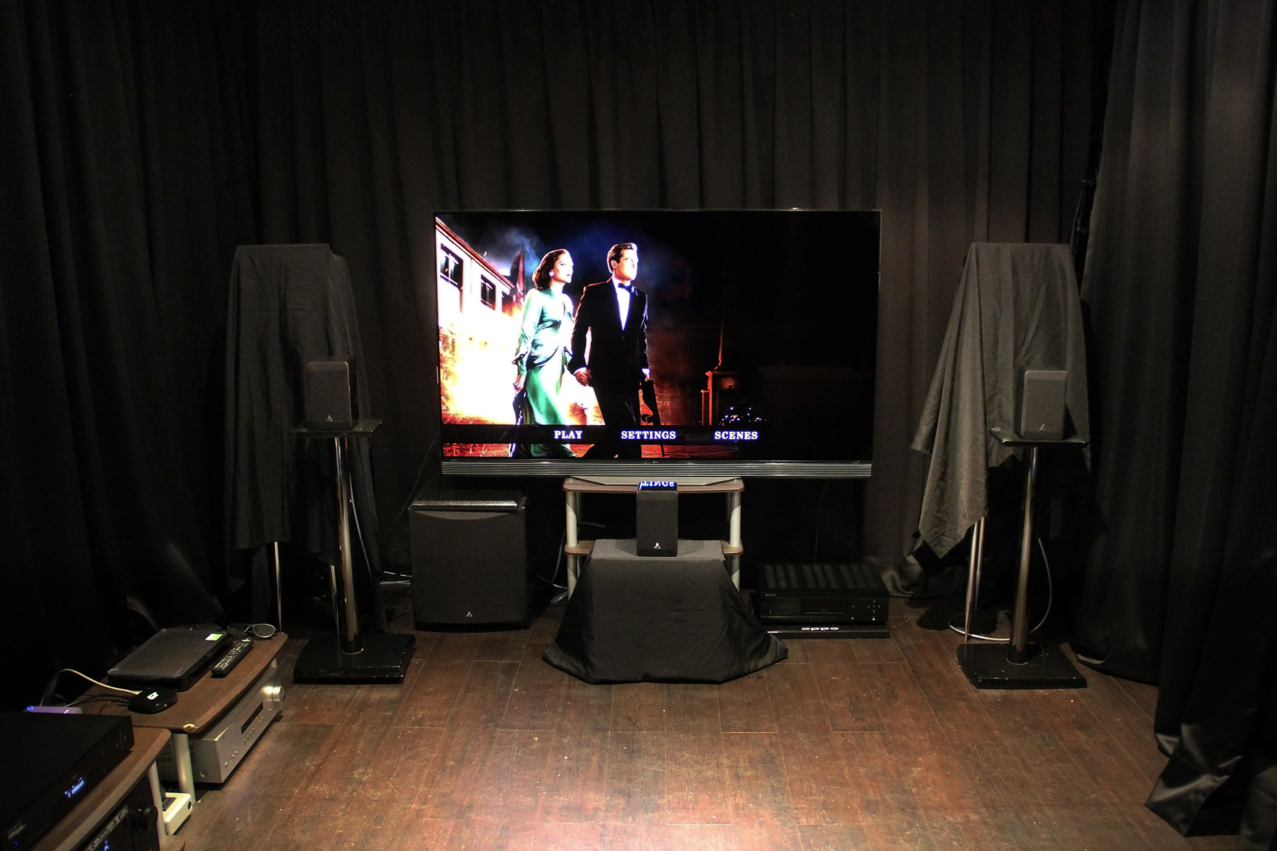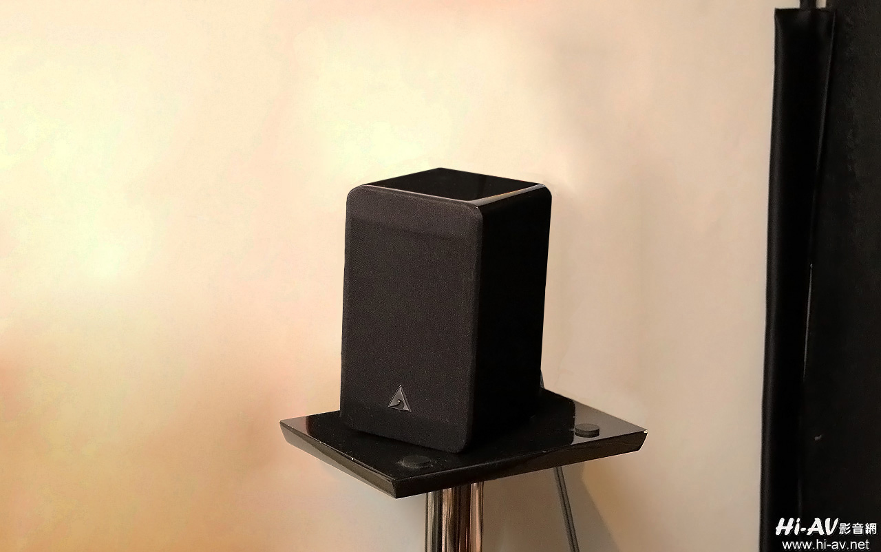 上圖喇叭架上的黑色鋼琴烤漆喇叭,就是在「歐酷」視聽室後方做為環繞聲道的Atlantic Technology LCR2喇叭。比較值得注意的是,雖然「歐酷」視聽室天花板另外裝有兩支嵌入式喇叭做為天空喇叭,但此次在聆聽過程裡並沒有使用,照理說這兩支 Atlantic Technology LCR2 喇叭應該要裝在側面較高的位置,不過它們仍然設置在與視聽座位耳朵一樣高度處。令我們感到訝異的是,即使如此,整套Atlantic Technology LCR2 5.1聲道喇叭系統的「上方音場」表現還是非常好,這顯示此款LCR喇叭的聲音擴散性與包圍能量相當出色。