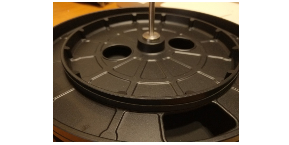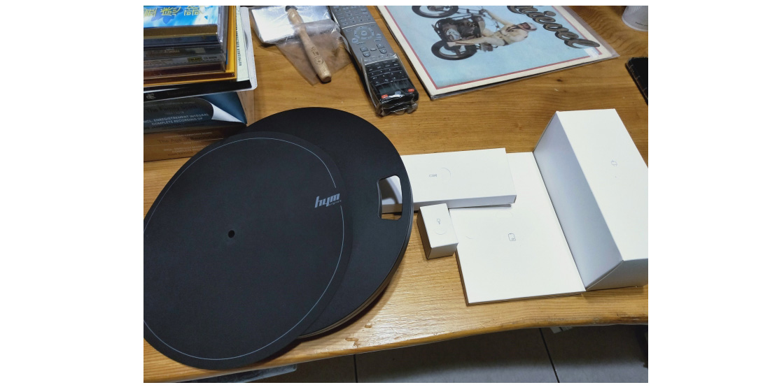 開箱機器裡面有矽膠的唱盤墊、不鏽鋼的金屬轉盤(皮帶也在上面)