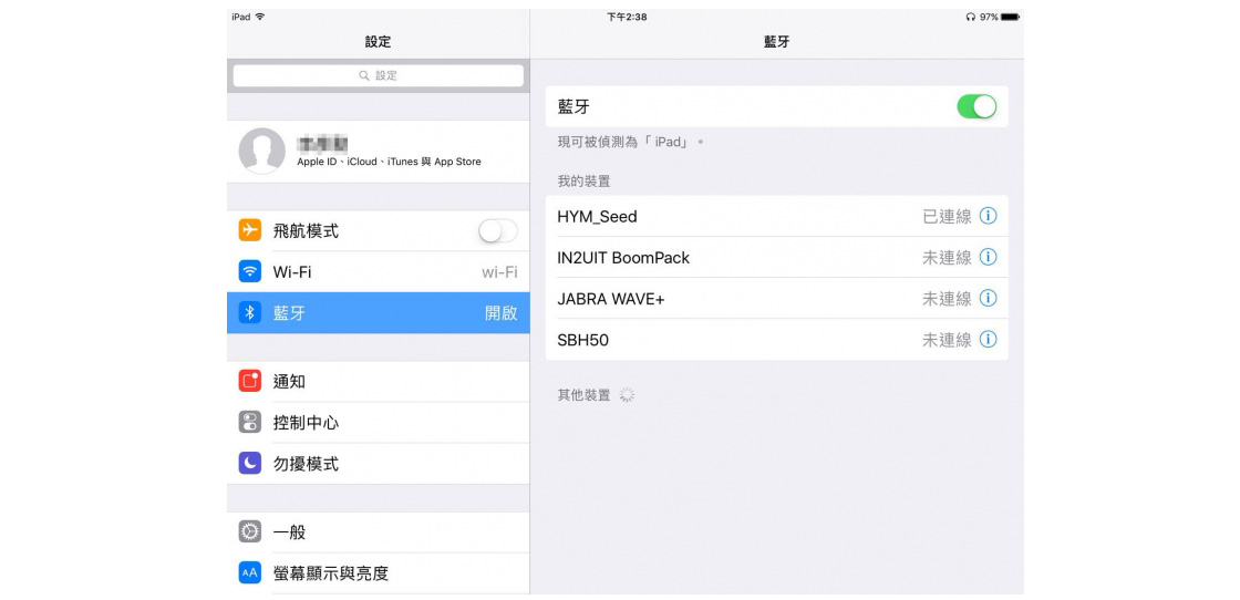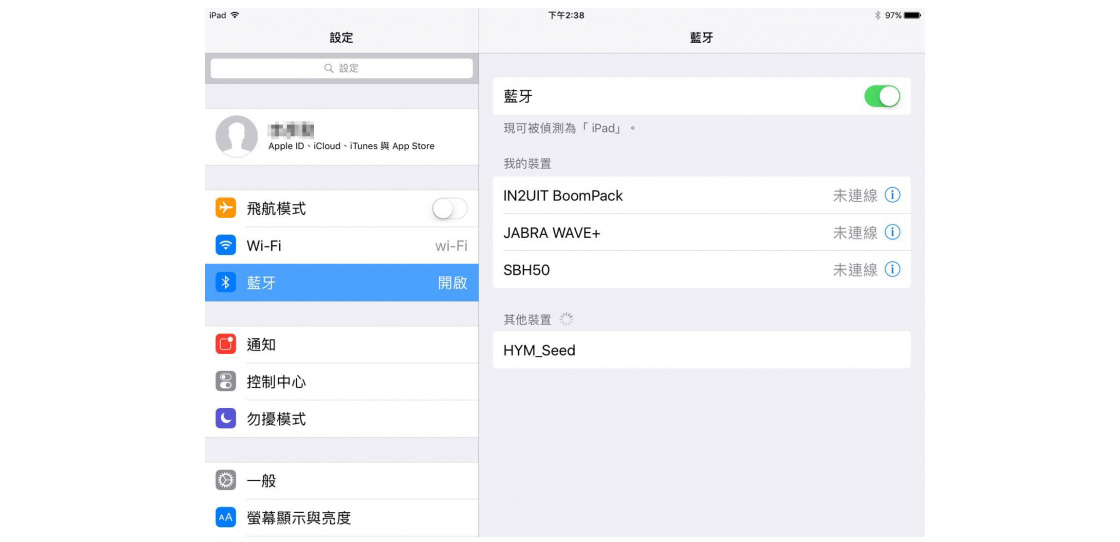 打開ipad切到藍牙,找到HYM_Seed,也是快速就連接上,會聽到seed發出“滴”一聲