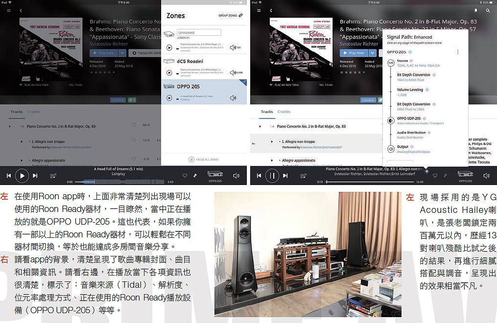 至於在系統組成方面,Roon也有多種方式, 而現場的方式是以 QNAP NAS 做為儲存檔案的伺服器(Roon Core)。操作的媒介是平板上的Roon app。而播放器材就是OPPO UDP-205 4K播放機,它與NAS之間以網路線連接。現場這種接法是最方便也最穩定的,不需要經過電腦,能省去操作和干擾的問題,而採用NAS則可以得到穩定、快速、隨時備份等好處。
