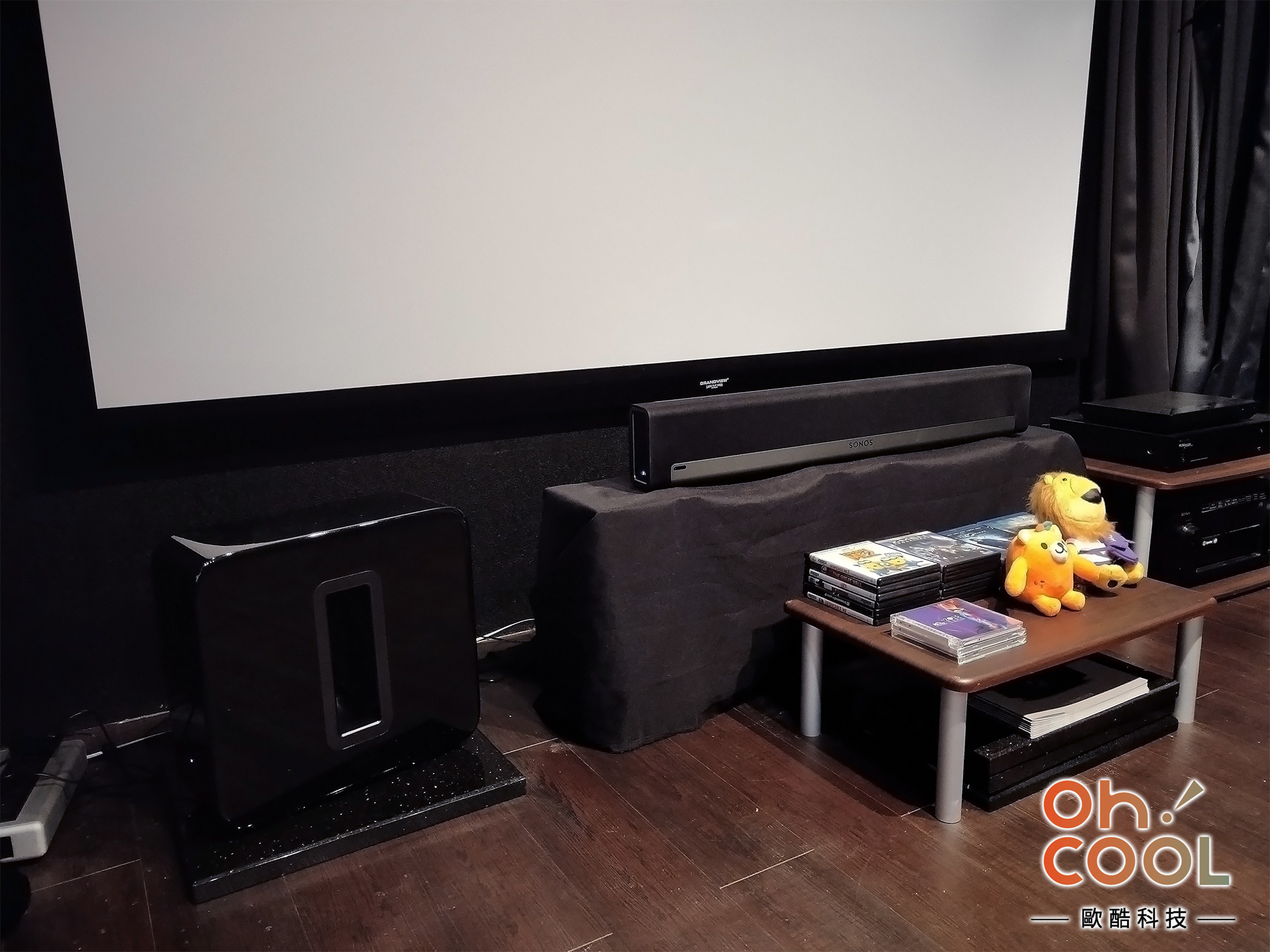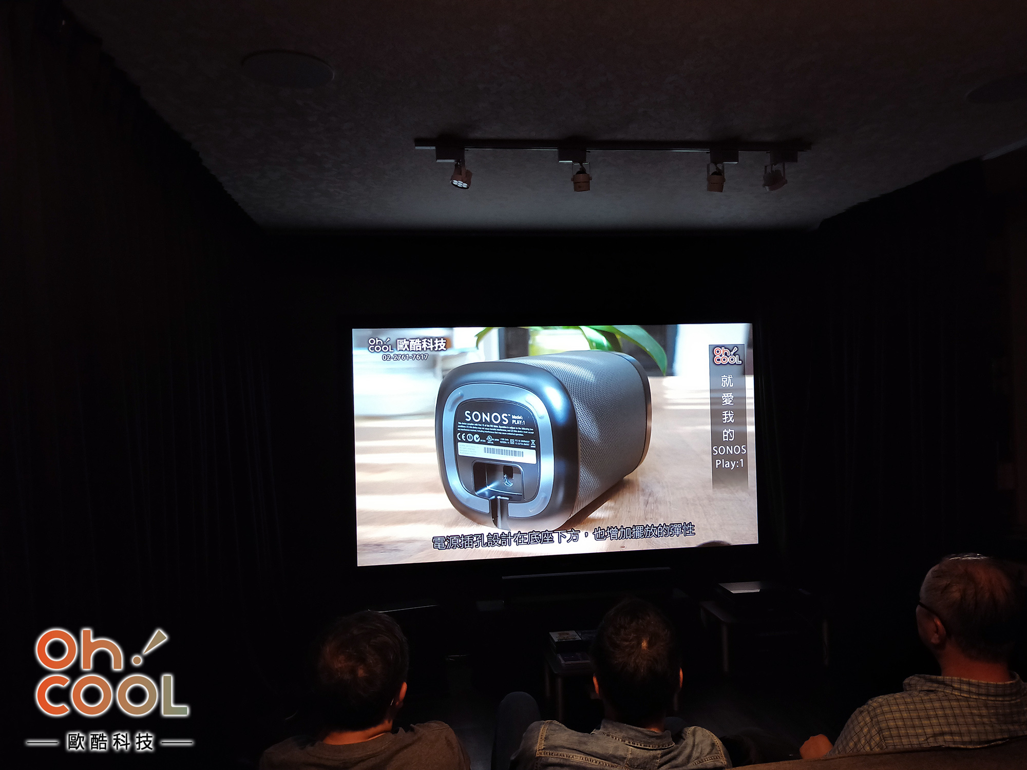 歐酷在五月初就已經佈置好了 SONOS 的無線 5.1 聲道系統,所以出聲器材的部分沒有做太大的變動,主要是把原本的 LG OLED 4K 電視和其他不相關的器材暫時先搬走,讓投影專用的 Grandview 106” 蓆白色固定幕重見天日,它可以忠實反映投影畫質。