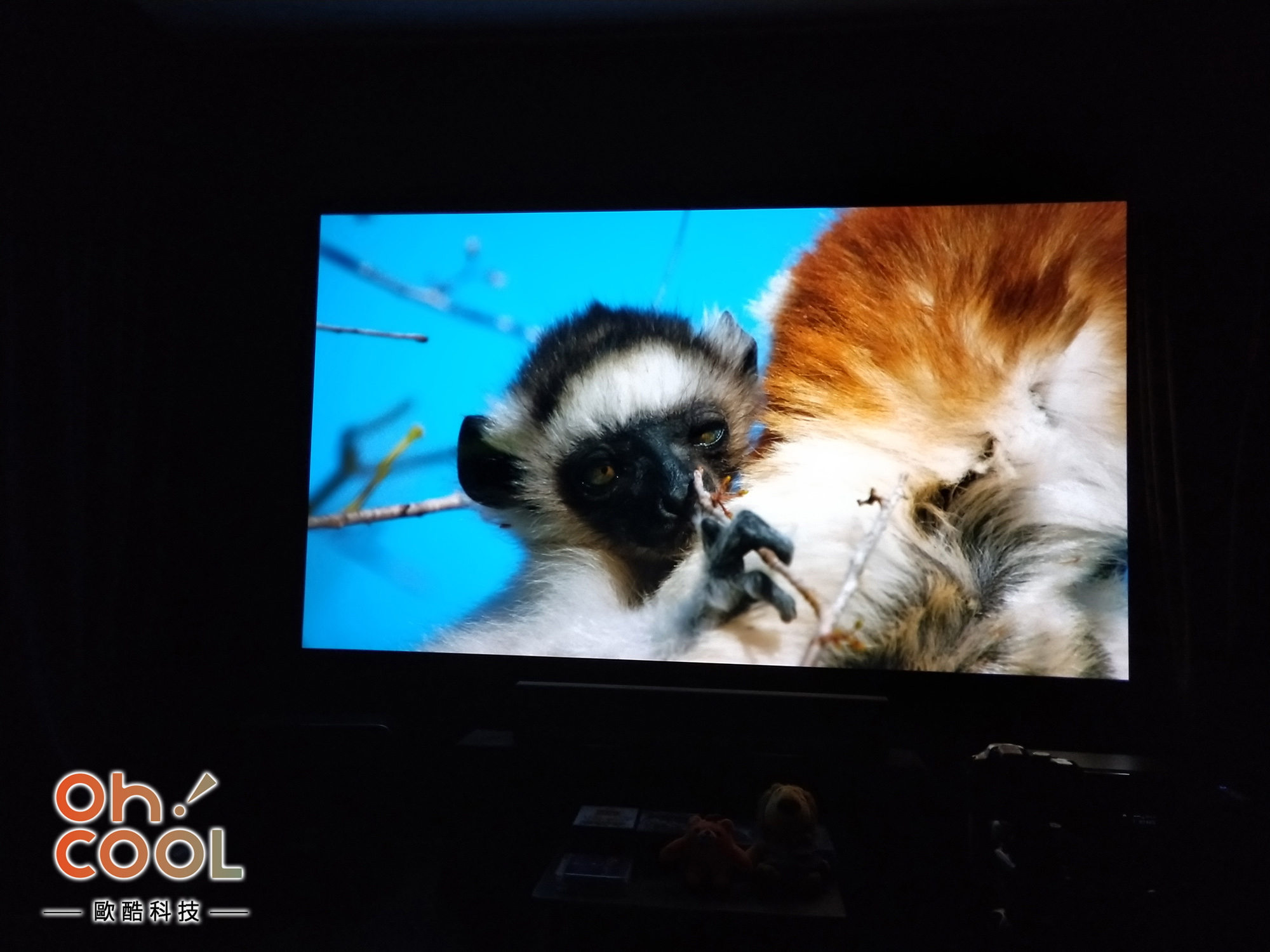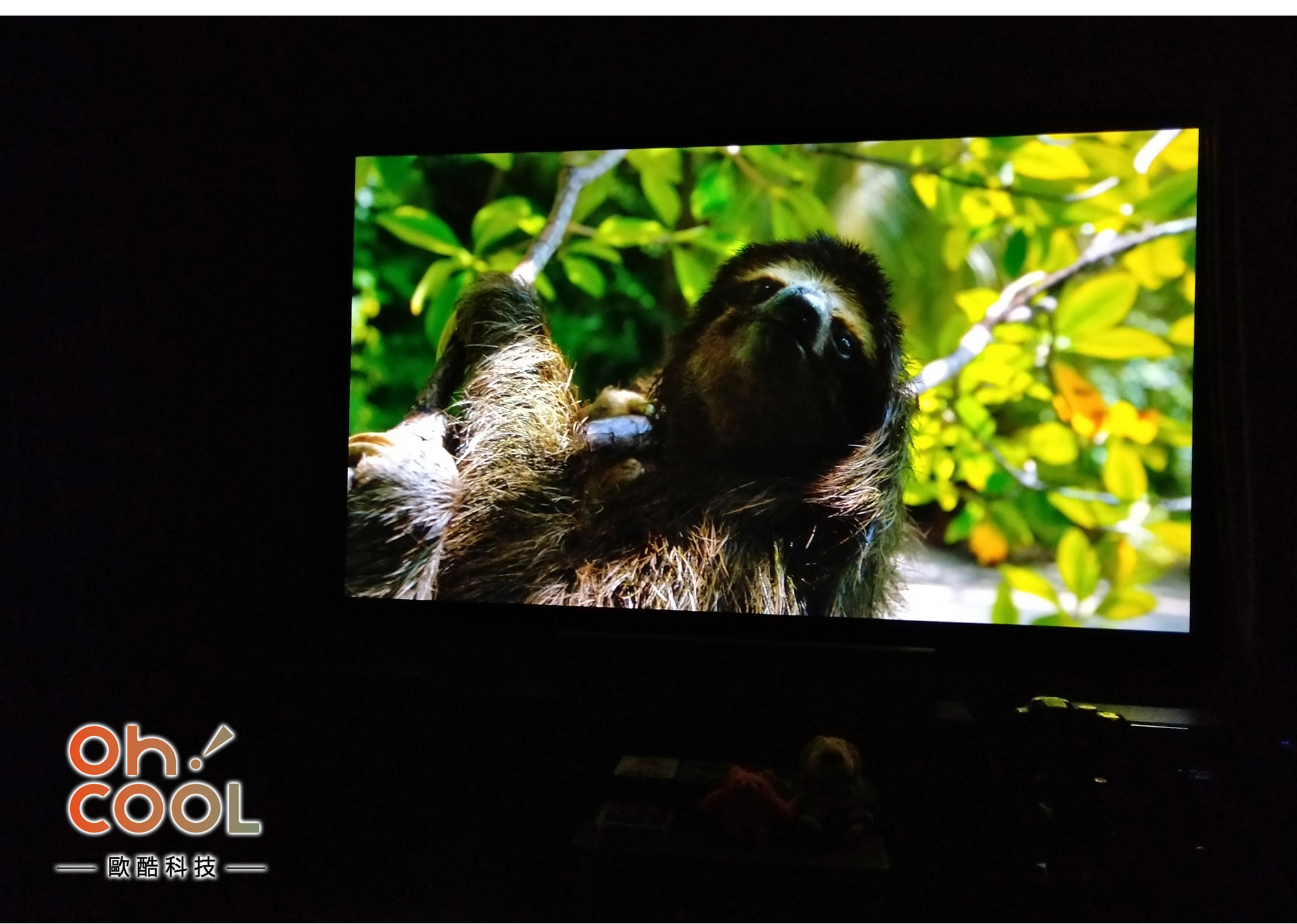 由於要特別強調整體聲光效果,我們精選了多部 4K 影片的精采片段;圖中我們可以看到【地球脈動第二季】中可愛的狐猴寶寶和動作溫吞的樹懶,透過 SONY VPL-VW570ES 投放出來,非常逼真寫實。