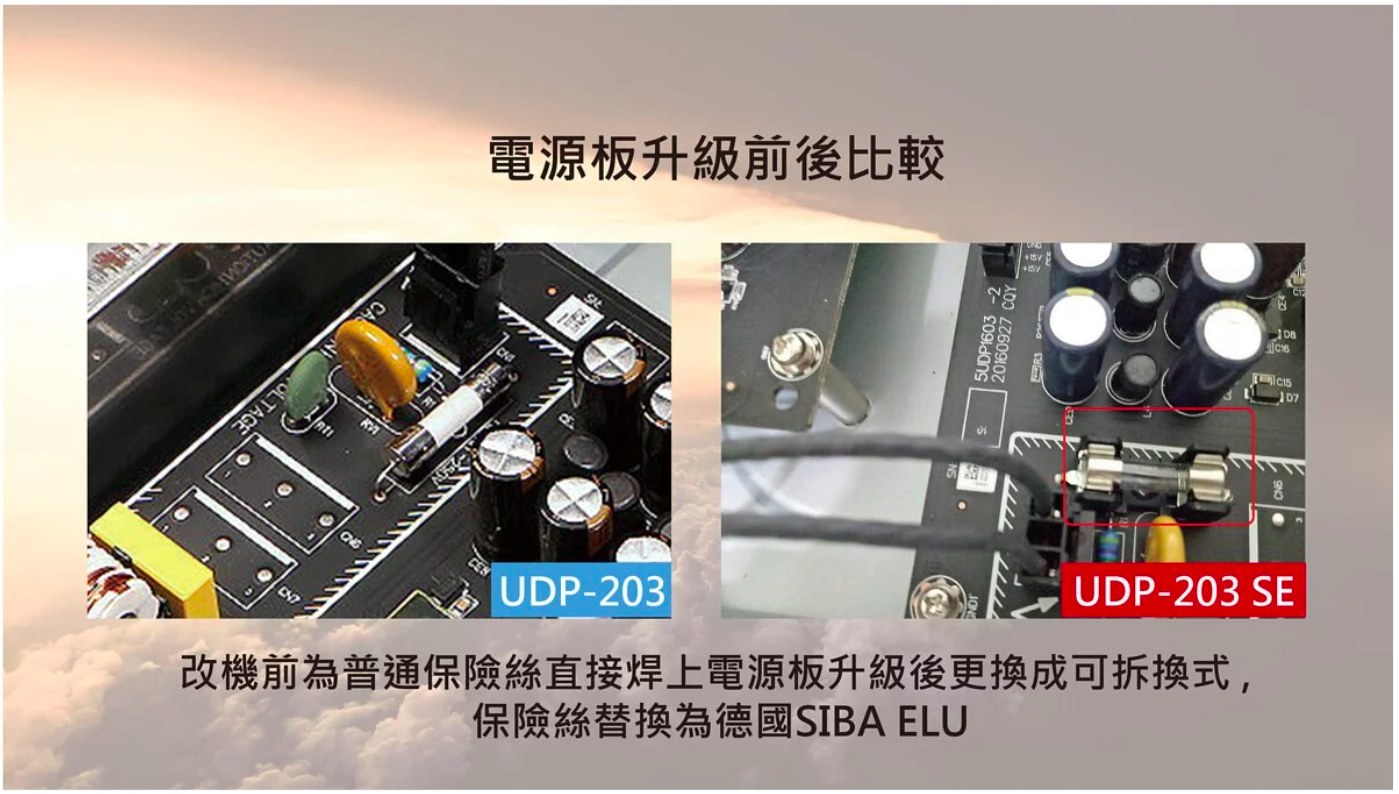 電源板的保險絲由原來直接焊上改為可拆換式設計,保險絲本體也替換為德國進口SIBA ELU廠牌