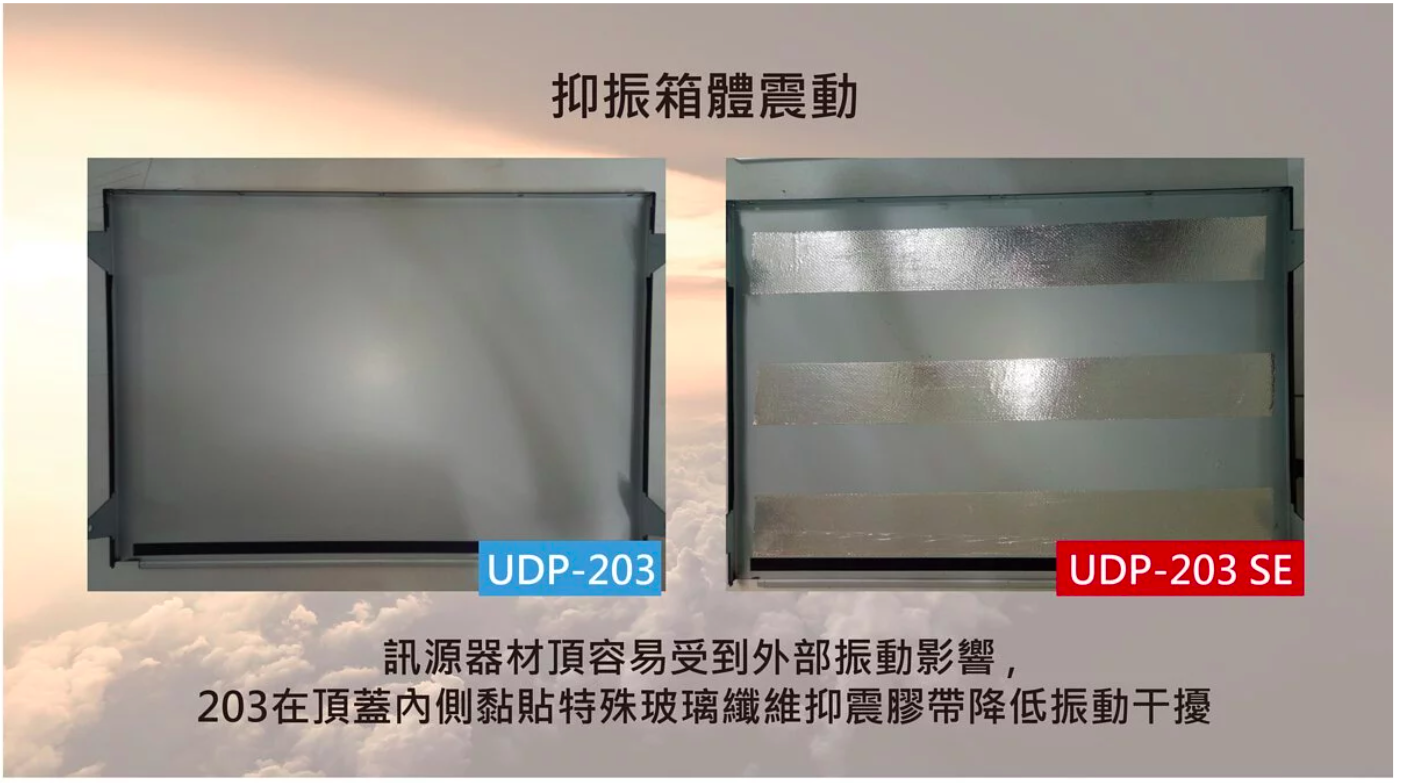 由於OPPO原廠在設計UDP-203時,吸收了許多過去的經驗。所以本次的上改採用類似嵌入下機體的作法,來提升 UDP-203 本身的抑震功能讓音質輸出部分能夠達到水準。所以本次在對於頂蓋的加強方面,只需採用特殊玻璃纖維抑震膠帶,就能達到理想效果。