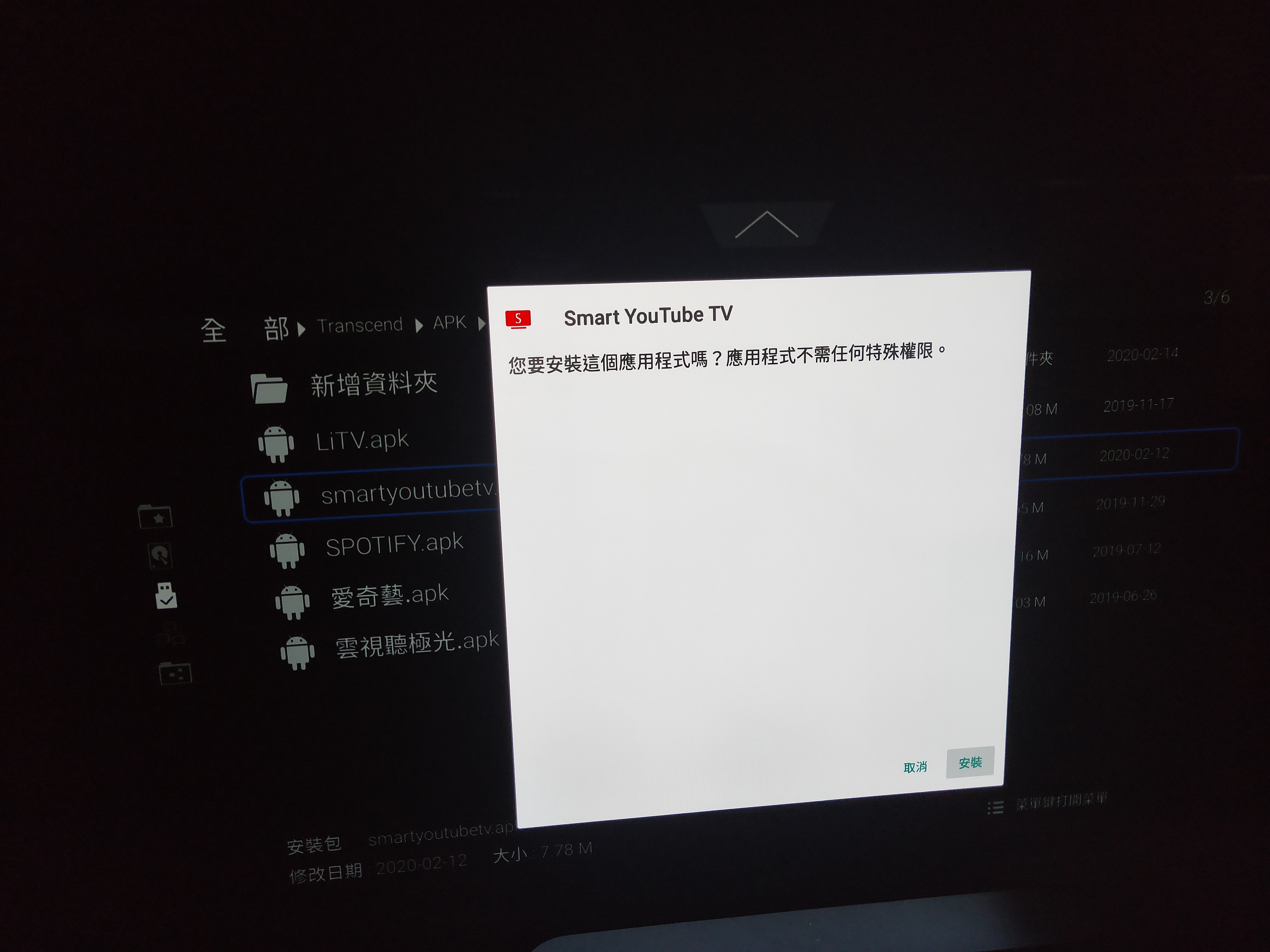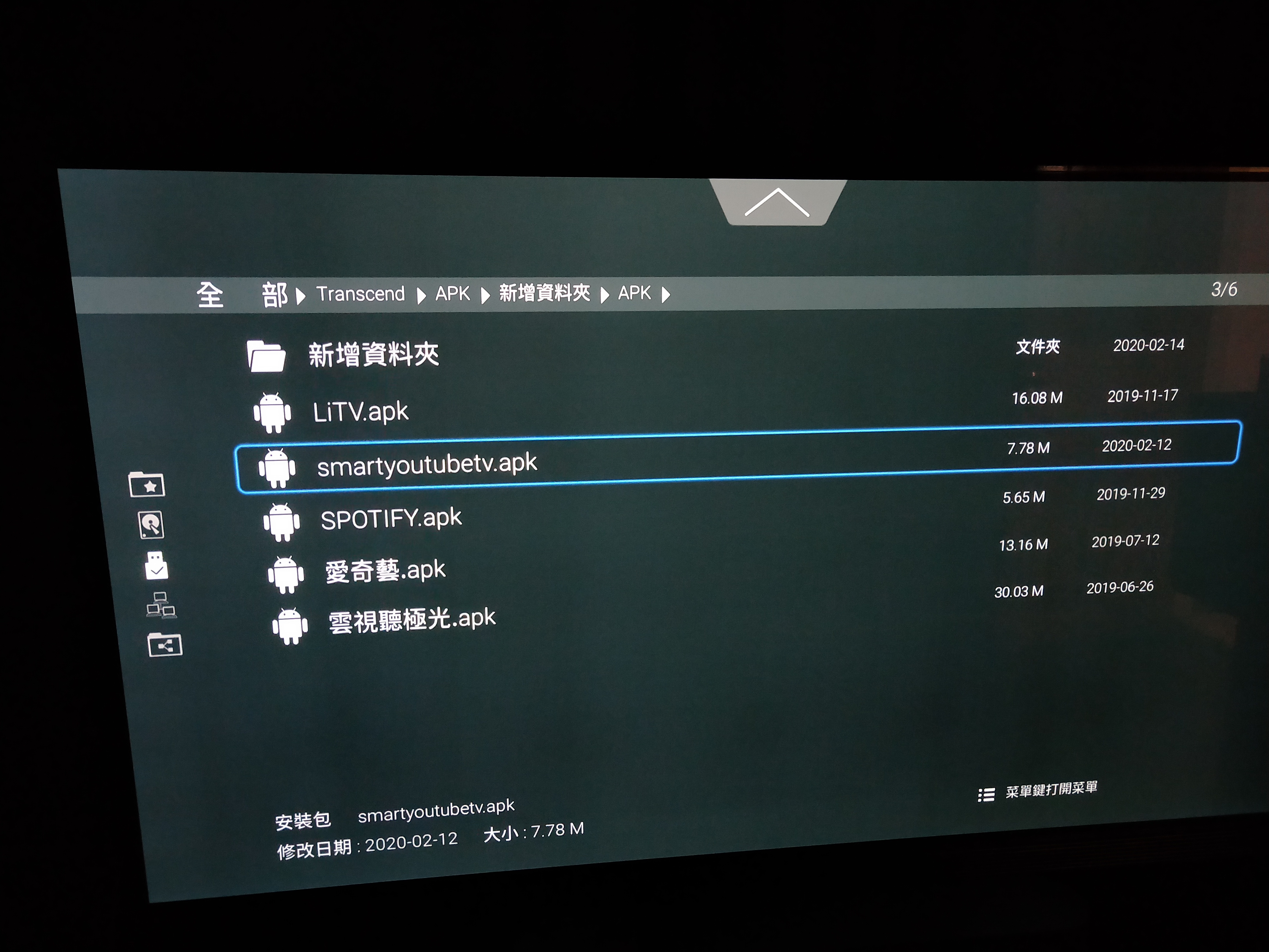 1.將smartyoutube.apk下載至USB隨身碟根目錄插上機器後點選執行安裝