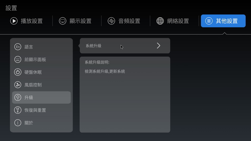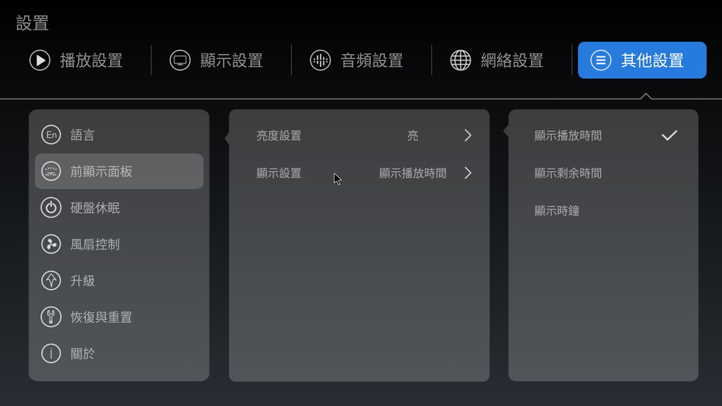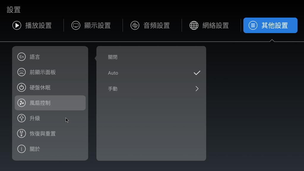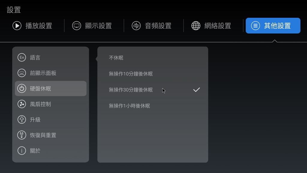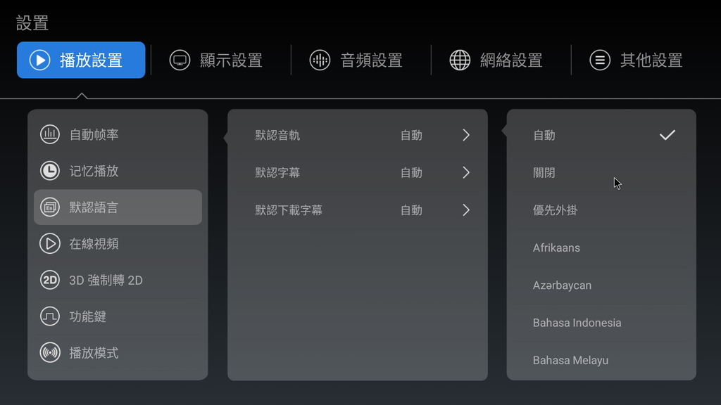▼開機後會有一些設定的流程,例如介面語言與網路設定,接著就進入主選單,我們先看看設定中有那些選項,「撥放設置」中有默認的音軌或字幕可選擇,不然每次看片都要切換就太麻煩了。有注意到嗎?字幕是可以自動匹配下載的,等於省去很多自己整理的時間,而且「自動偵率」還可以調整字幕的時間軸,功能強大。