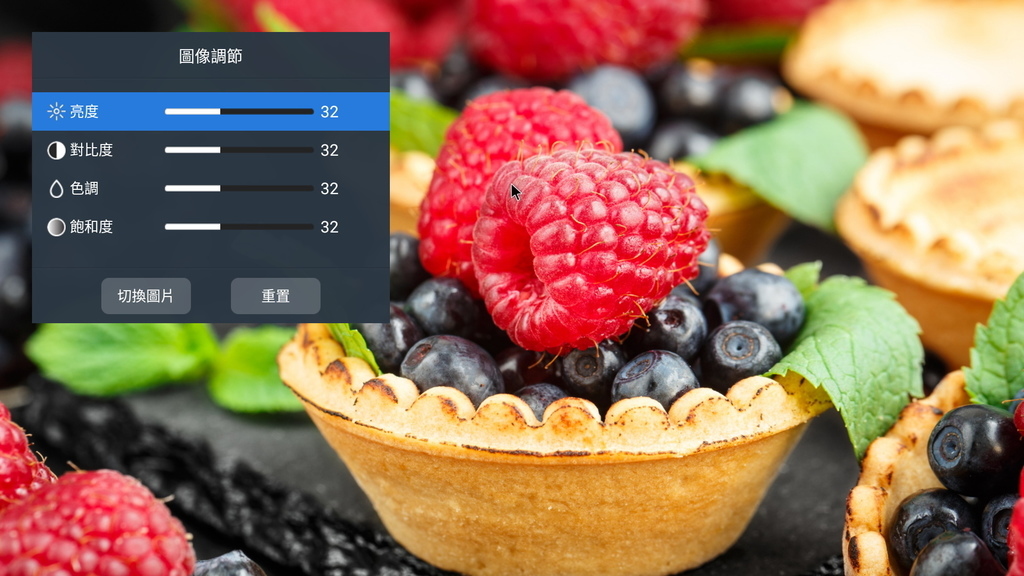 ▼「圖像調節」會出現一張鮮豔的底圖當作參考,可以調整亮度、對比度、色調、飽和度等等