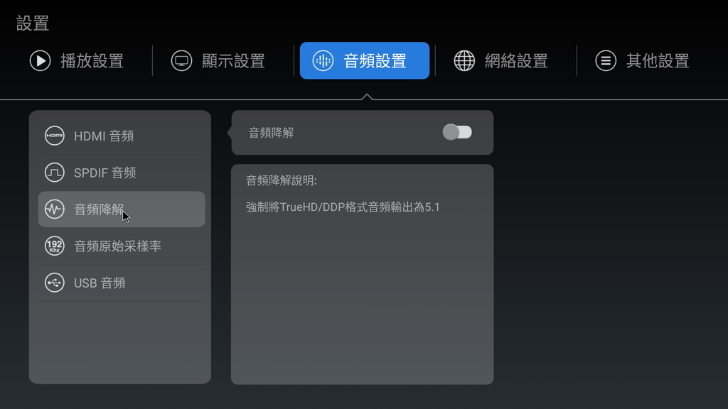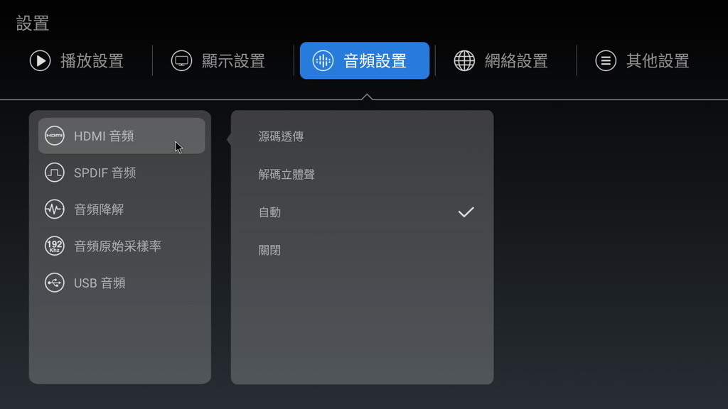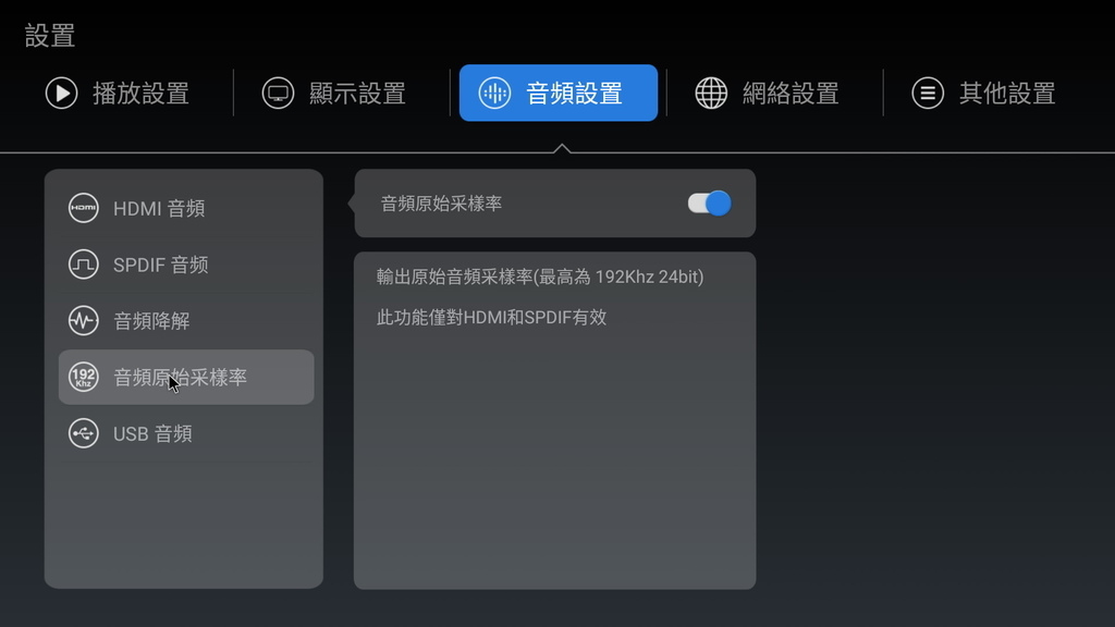 ▼「音頻設置」裡面,如果有另外的解碼設備,例如有更好的擴大機,就可以選擇「源碼透傳」(pass-through 或源碼輸出)將原始的聲音採樣率輸出給擴大機