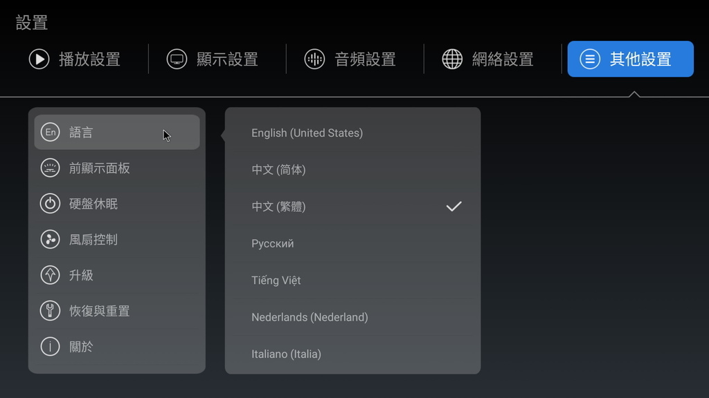 ▼「其他設置」裡面,語言的部分有很親切的繁體中文,畢竟這台機器西楓大也是多少有涉入的,用詞用語也有部分在地化的修正