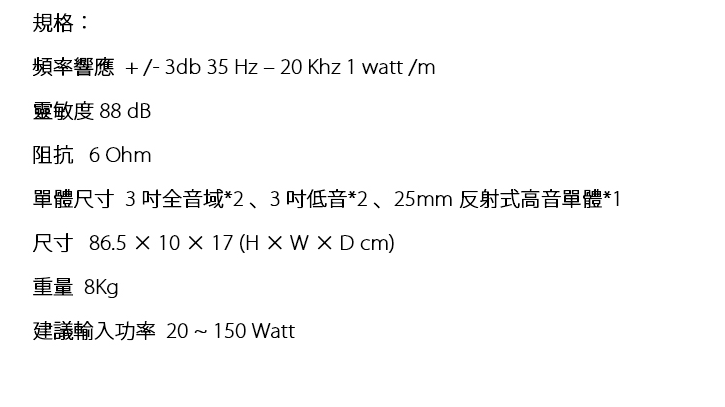 單體尺寸  3吋全音域 * 23吋低音 * 2