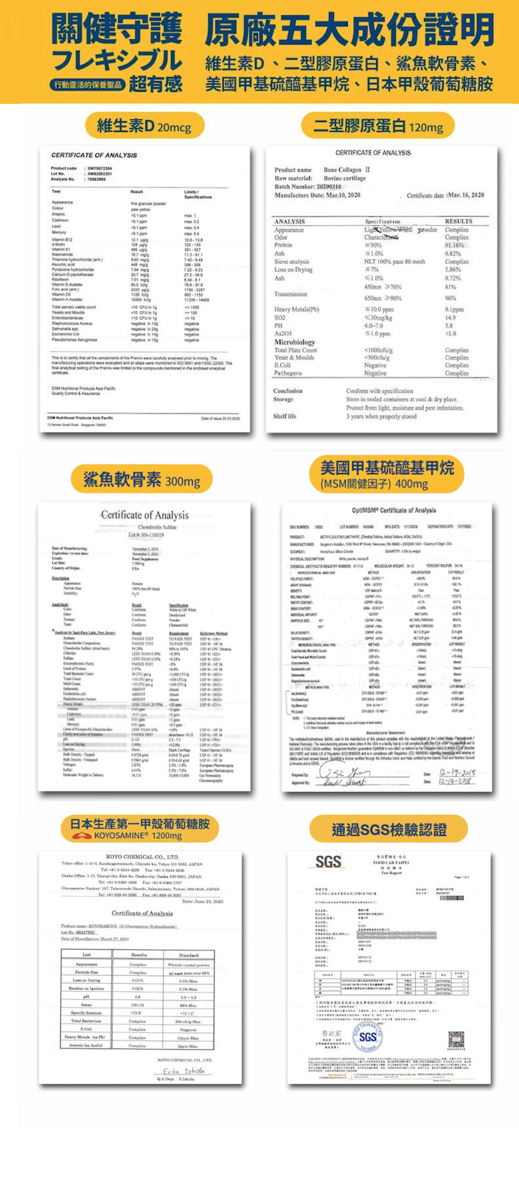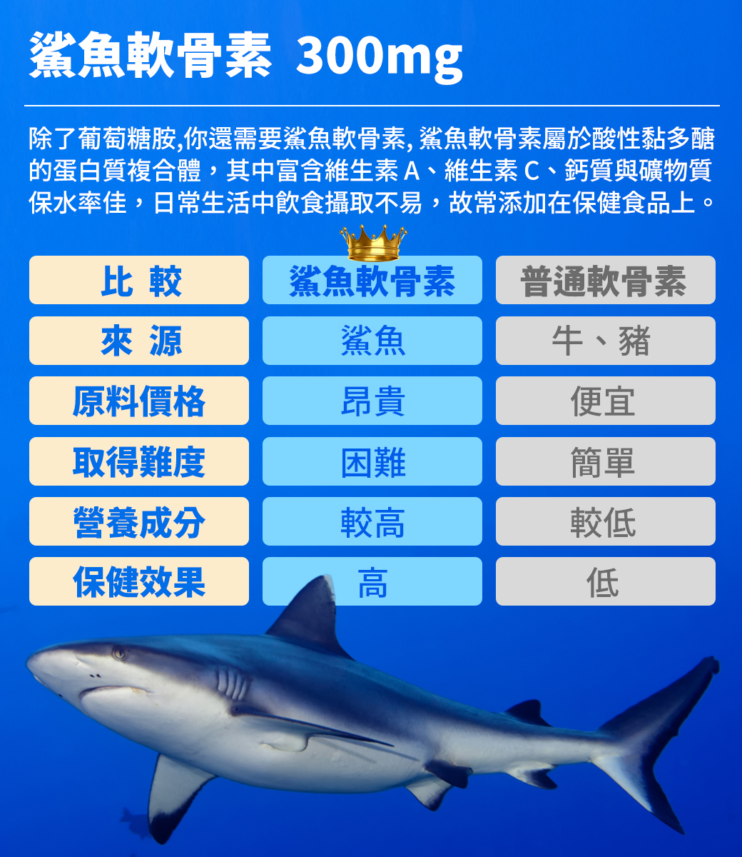 每日六粒成分含量:維生素D 20mcg、二型膠原蛋白 120mg、鯊魚軟骨素 300mg、MSM 400mg、葡萄糖胺 1200mg