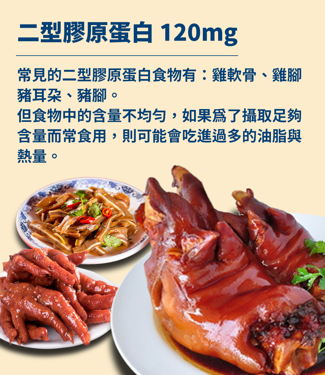 每日六粒成分含量:維生素D 20mcg、二型膠原蛋白 120mg、鯊魚軟骨素 300mg、MSM 400mg、葡萄糖胺 1200mg