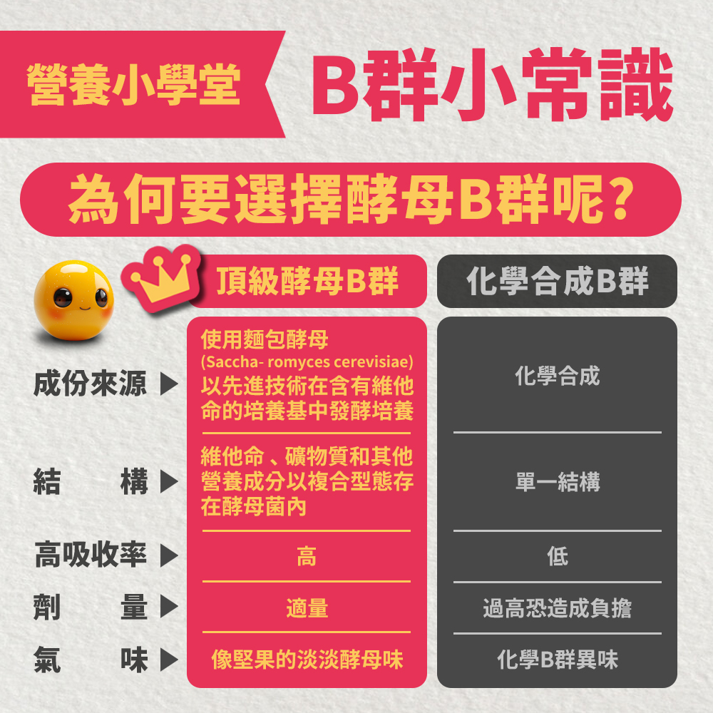 成分:啤酒酵母發酵物 (啤酒酵母粉、菸鹼酸、本多酸鈣、維生素B1、維生素B2、維生素B6、生物素、葉酸、維生素B12)、維生素C。
